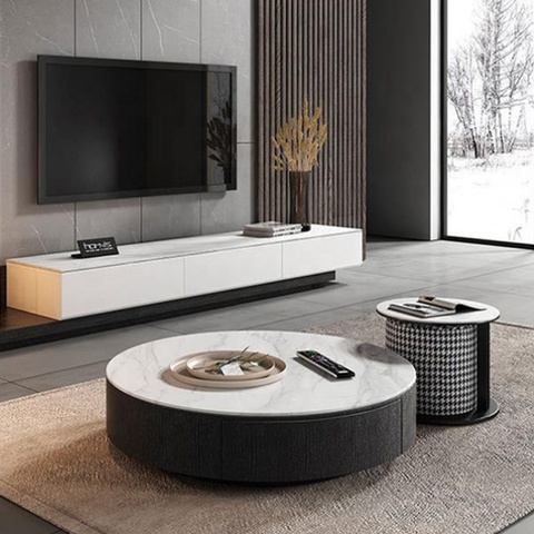 新しいモダンなヴィラホテルホームデザインTVユニットリビングルーム家具セット木製大理石トップコーヒーテーブル収納付き